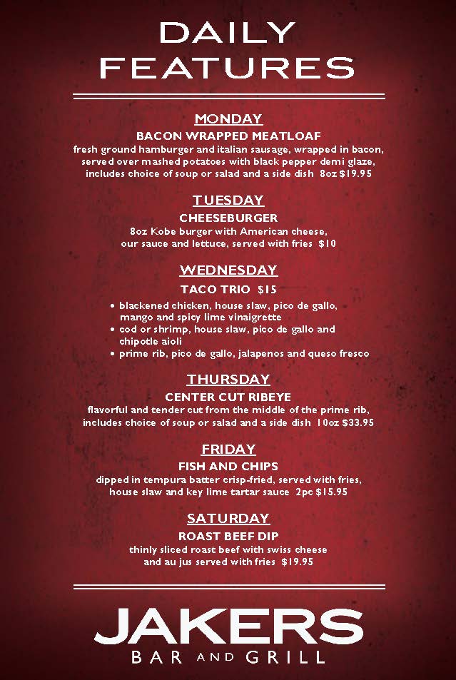 Jakers’ takeout and delivery entrées are freshly prepared, served hot, and ready for pickup so you can enjoy them at your convenience. Avoid the crowded grocery store and treat yourself to a special meal. Simply select a service below to start your order.
